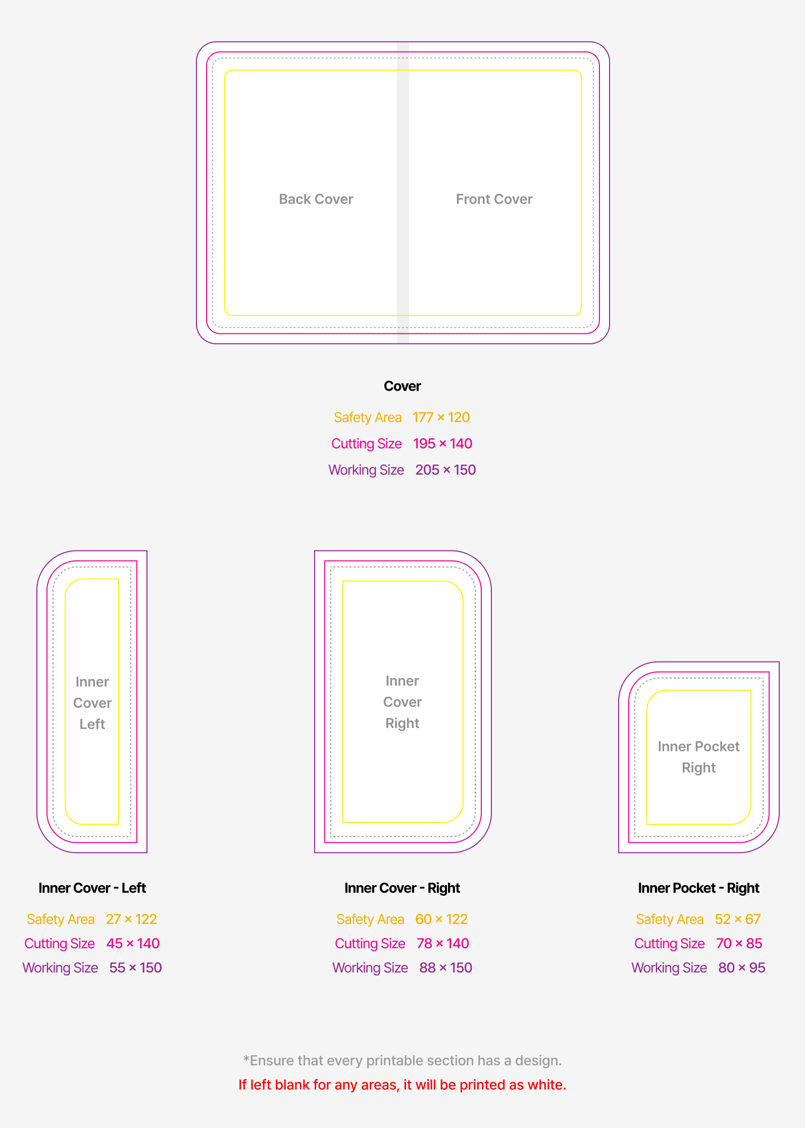 Ensure that important content such as wordings are at least 6mm inwards from the cutting size.