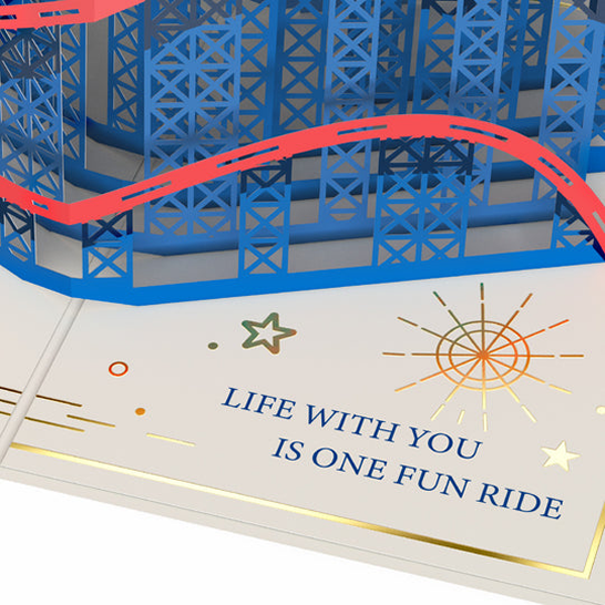 Open the card to reveal an intricate 3D roller coaster, complete with